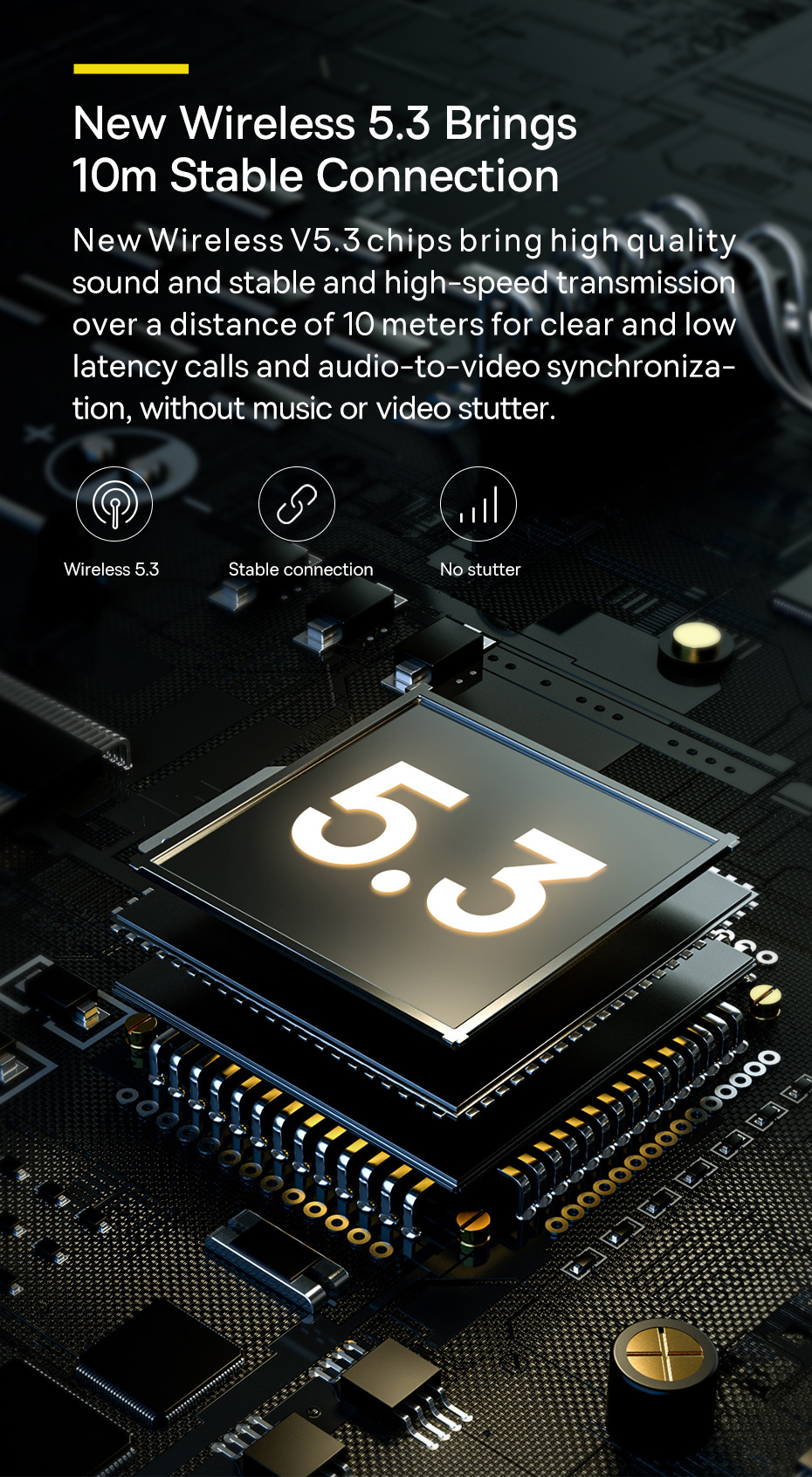 2. New Wireless V5.3 chips bring high quality sound and stable and high-speed transmission over a distance of 10 meters for clear and low latency calls and audio-to-video synchronization, without music or video stutter.