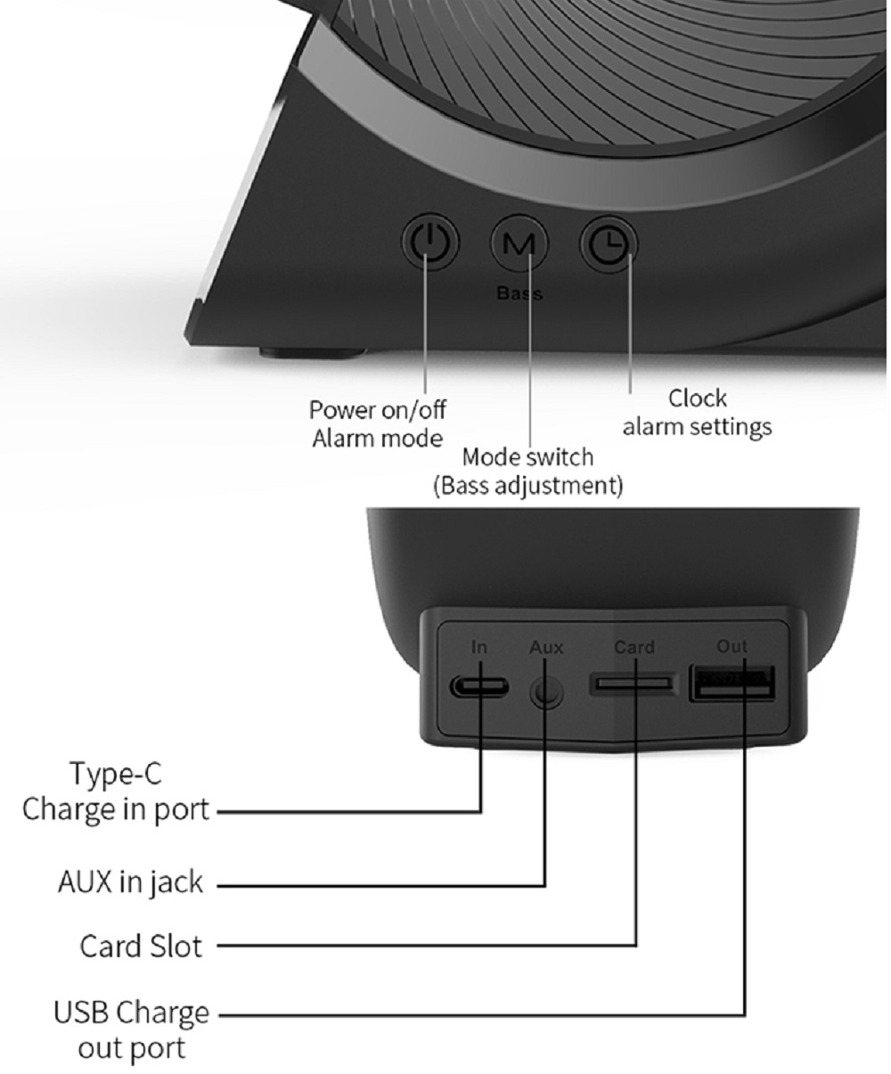 Mode: Bluetooth Mode, FM Radio Mode, T-card Mode, AUX Mode, Clock Mode